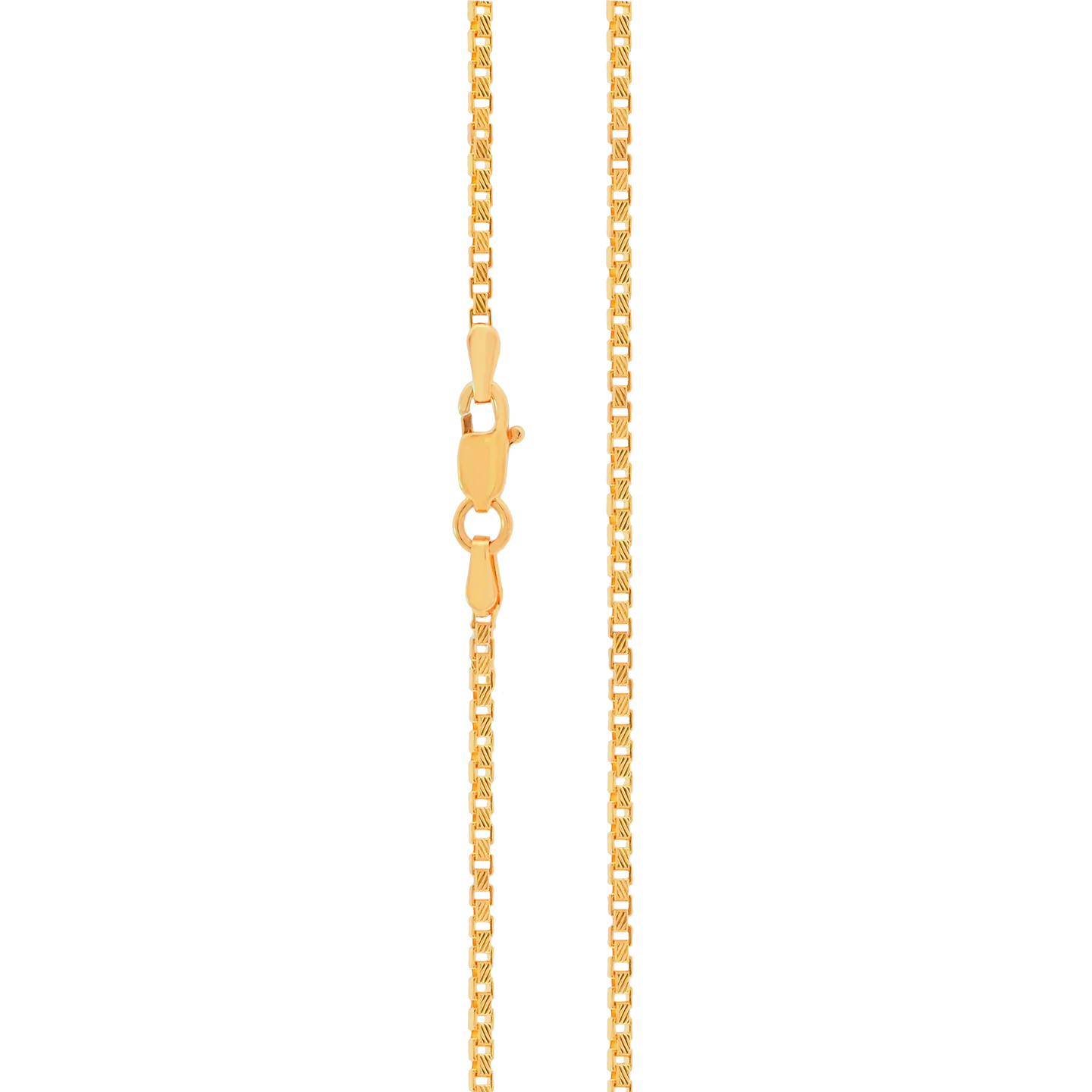 22k gold box chain in 20 inches. Solid gold chain with classic box design. Chain measures 1.5mm in thickness and features secure lobster clasp closure.