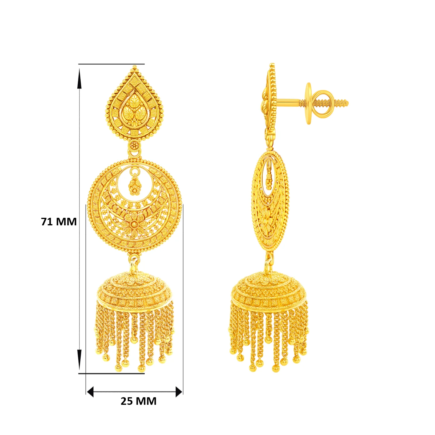 22K Gold Filigree Raindrop Jhumka Chandbali Earrings with Long Dangling Balls