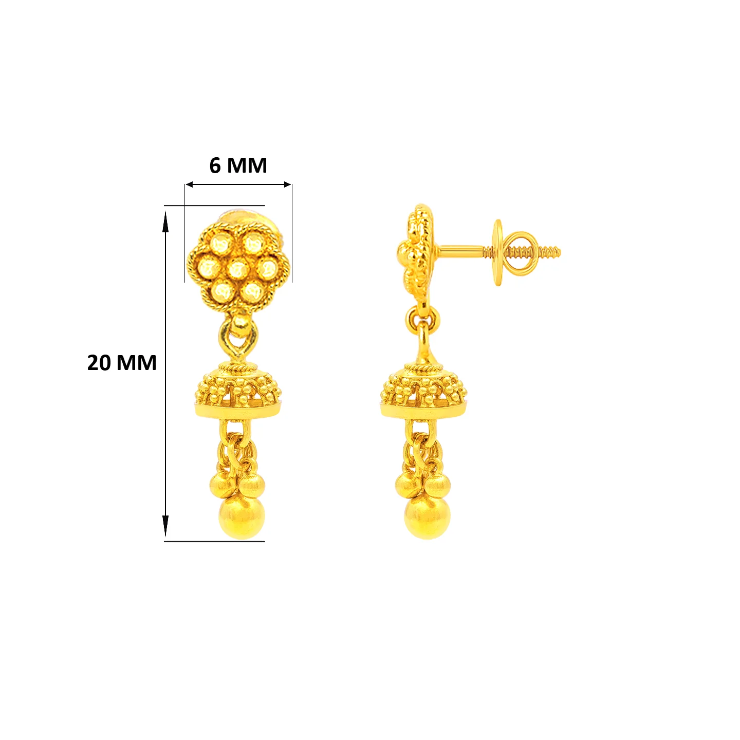 22k gold jhumka earrings. Earring design features floral screwback tops and ornate jhumka. Screwback top measures 6mm in diameter. Jhumkas measure 6mm in diameter. Earrings measure 20mm from top to bottom.