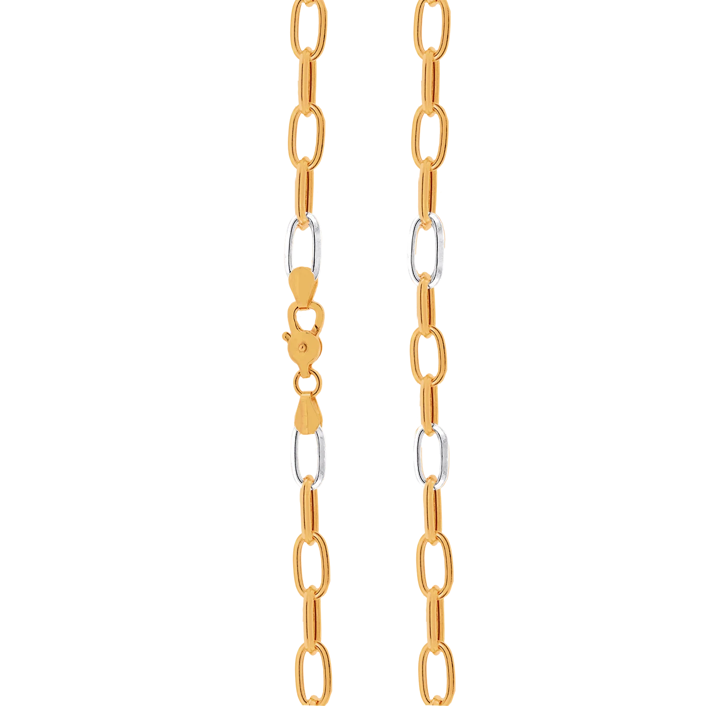 22k two tone gold paperclip style chain measuring 21 inches in length and 7mm in thickness. This stylish chain is lightweight and is sure to enhance your wardrobe.